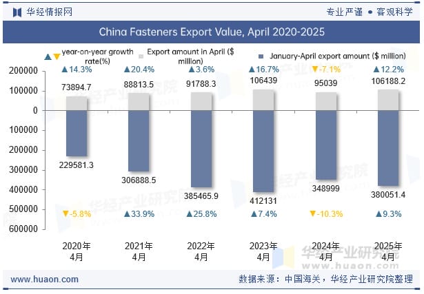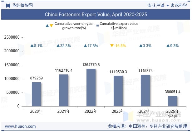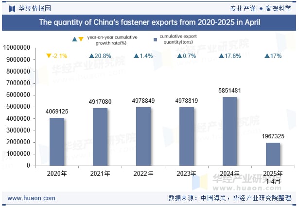 Os dados do Instituto de Pesquisa da Indústria da Huajing mostram que, em janeiro a abril de 2025, a quantidade de exportação dos fixadores da China foi de 1967325 toneladas, em comparação com o mesmo período do ano anterior, aumentou 283310 toneladas, um aumento de 17%; O valor da exportação de 380051,4 milhões de dólares americanos, em comparação com o mesmo período do ano anterior, aumentou em 31052,4 milhões de dólares americanos, um aumento de 9,3%.2025 April da China As exportações de prendedores totalizaram 536.285 toneladas; O valor da exportação é de US $ 106.182.000.