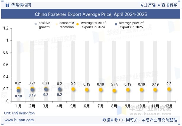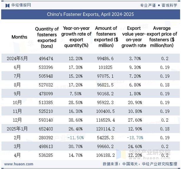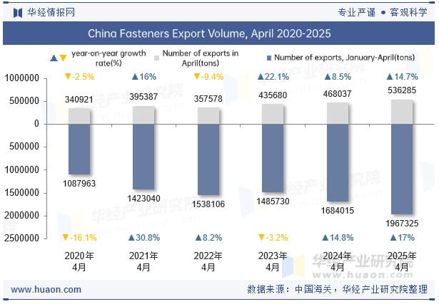 Em abril de 2025, a quantidade de exportação dos fixadores da China foi de 536.285 toneladas, em comparação com o mesmo período do ano anterior, um aumento de 68.248 toneladas, um aumento de 14,7%; o valor da exportação de 106.188.000 dólares americanos, em comparação com o mesmo período do ano anterior, um aumento de 111.492.000 dólares americanos, um aumento de 12,2%; O preço médio das exportações foi de 0,2 milhão de dólares / toneladas.